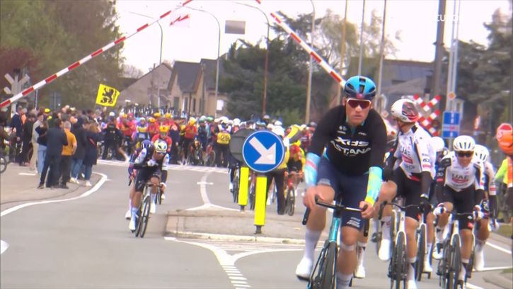 Peleton zatrzymany na przejeździe kolejowym podczas Ronde van Vlaanderen